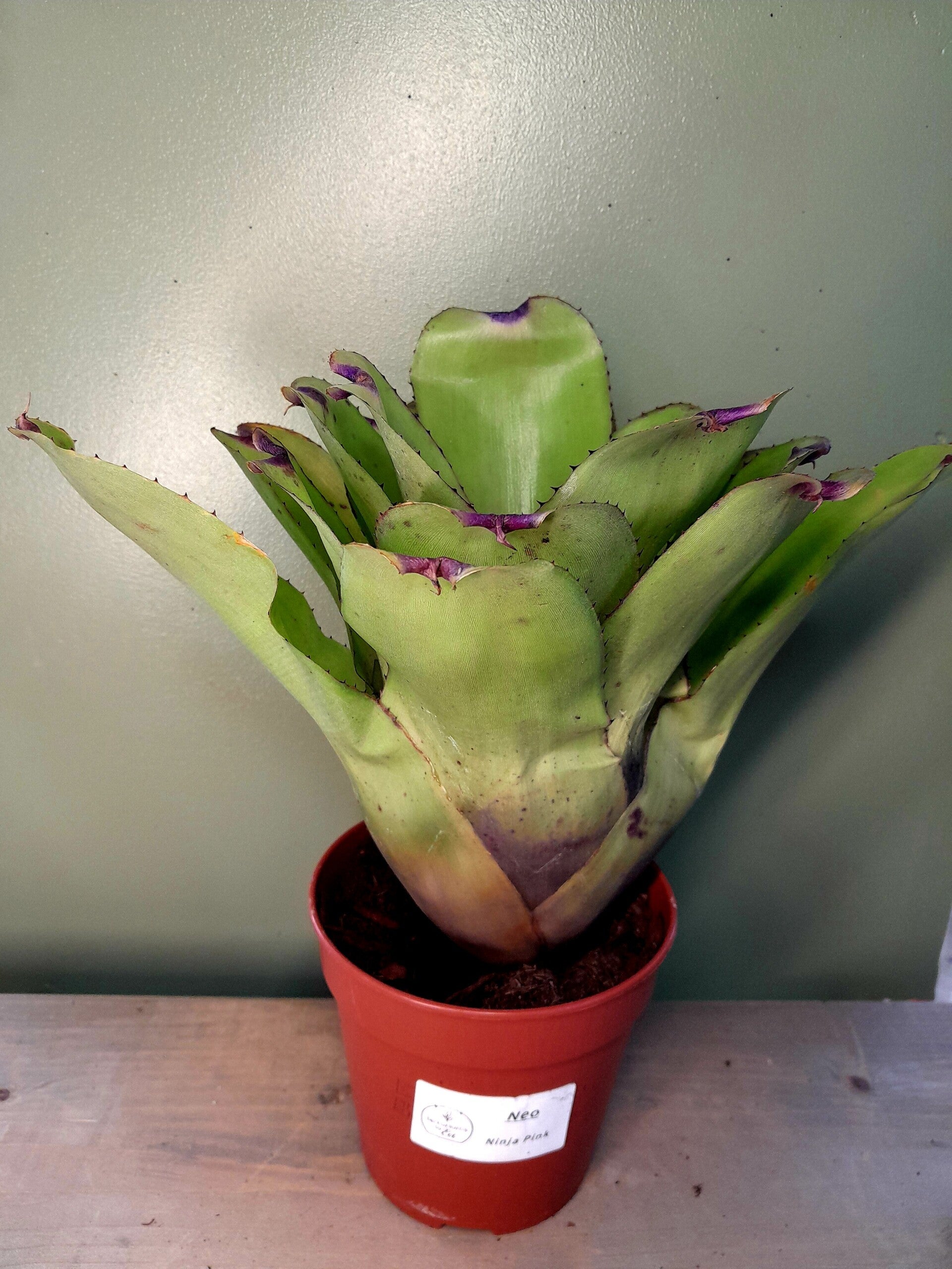 Deze bromelia heeft een prachtige groene kleur met mooie paarse tippen.