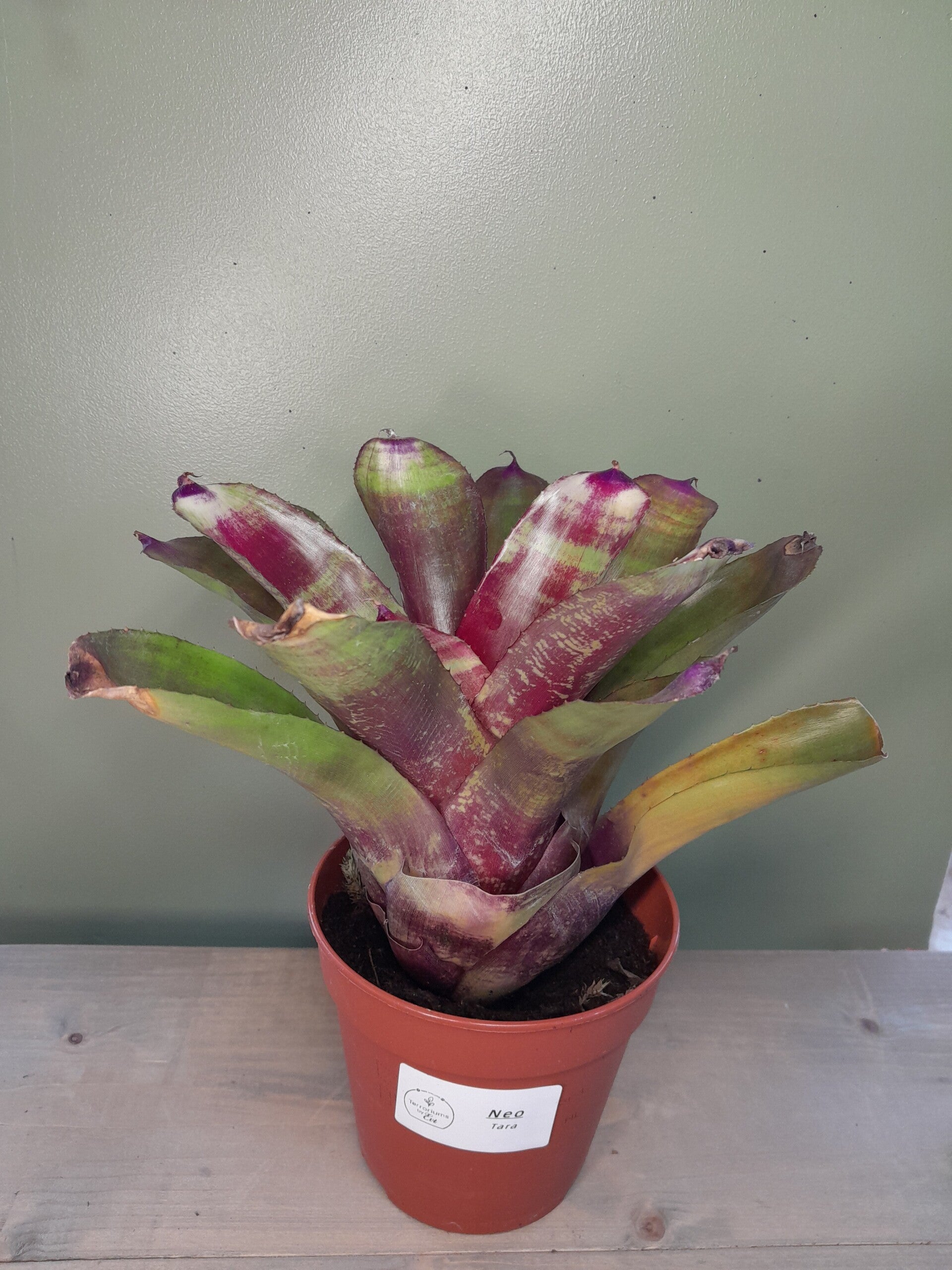 Deze bromelia is groen van kleur met mooie rood/paarse tijger strepen.