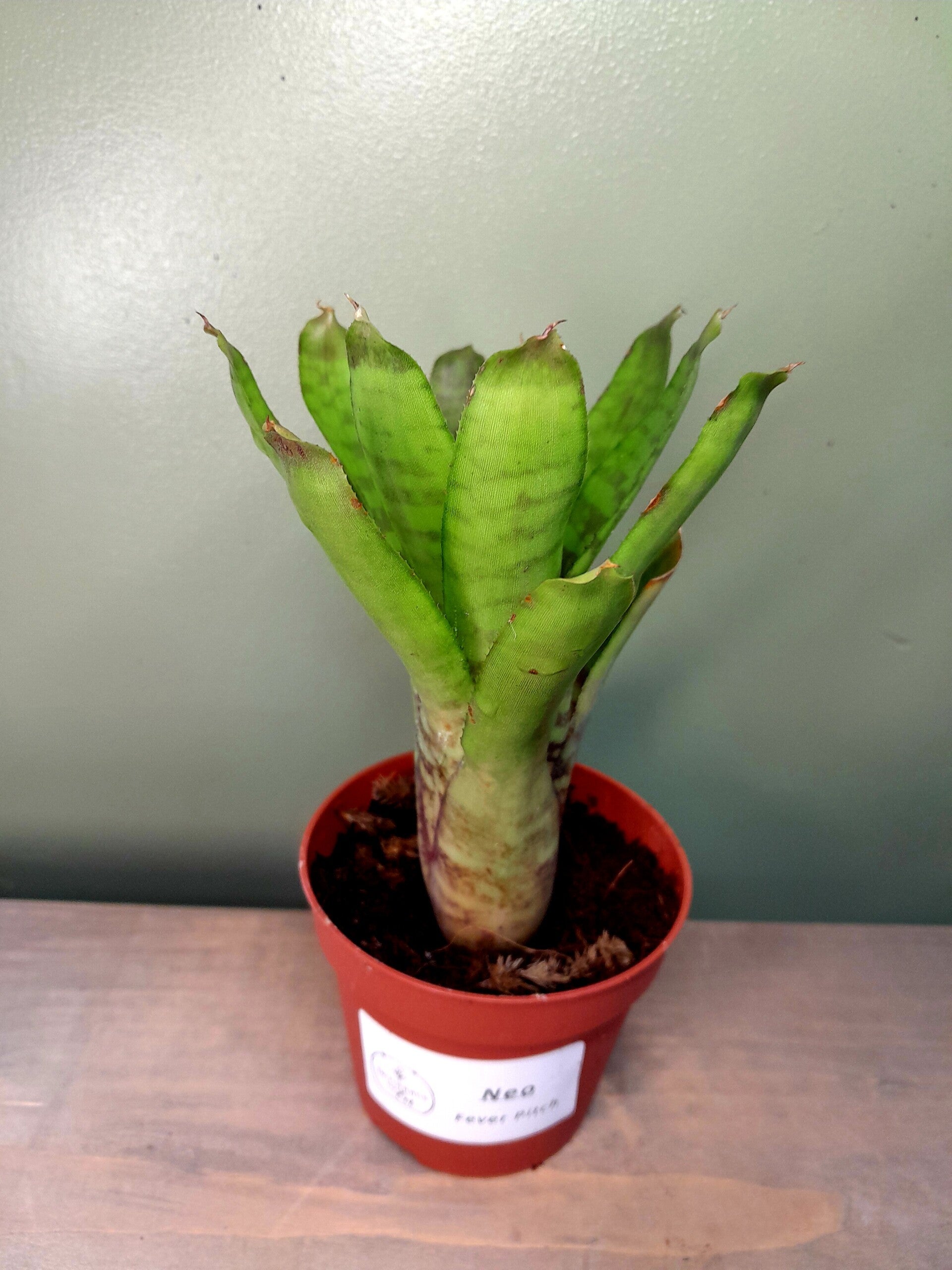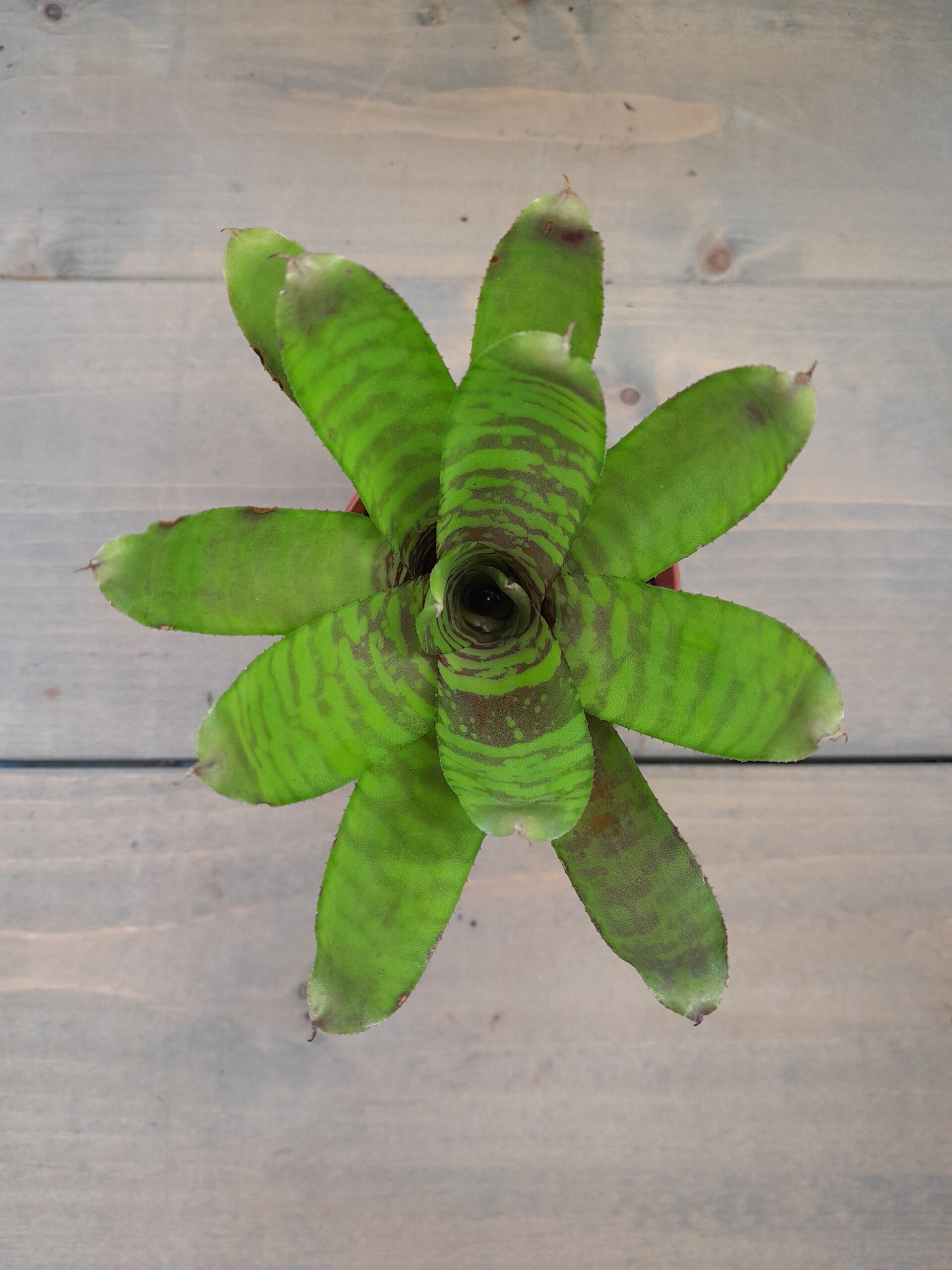Deze bromelia heeft een iets donkerder kleur groen met een mooi tijgerpatroon.