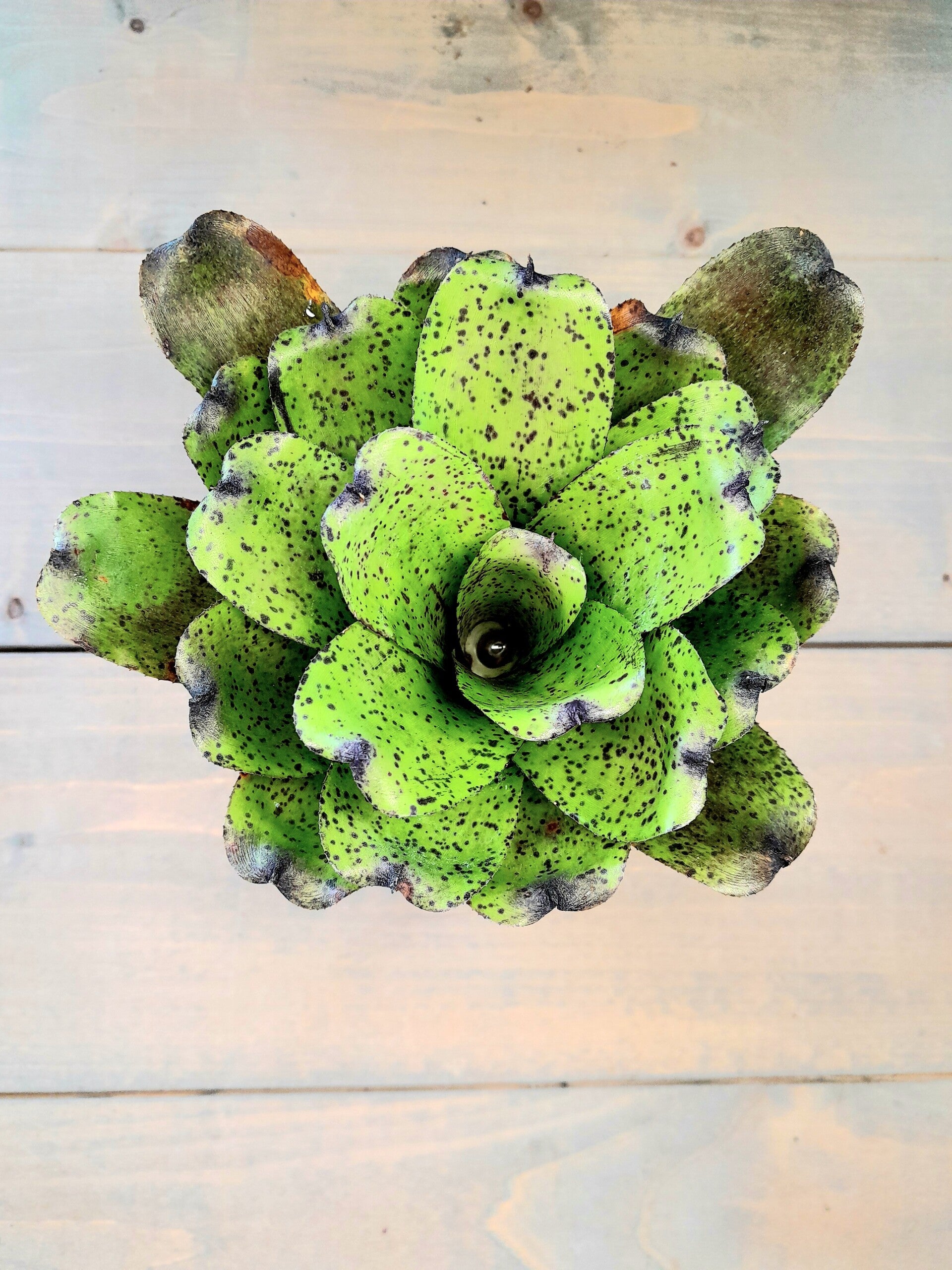 Deze bromela heeft een groene kleur met mooie paarse spikkels.