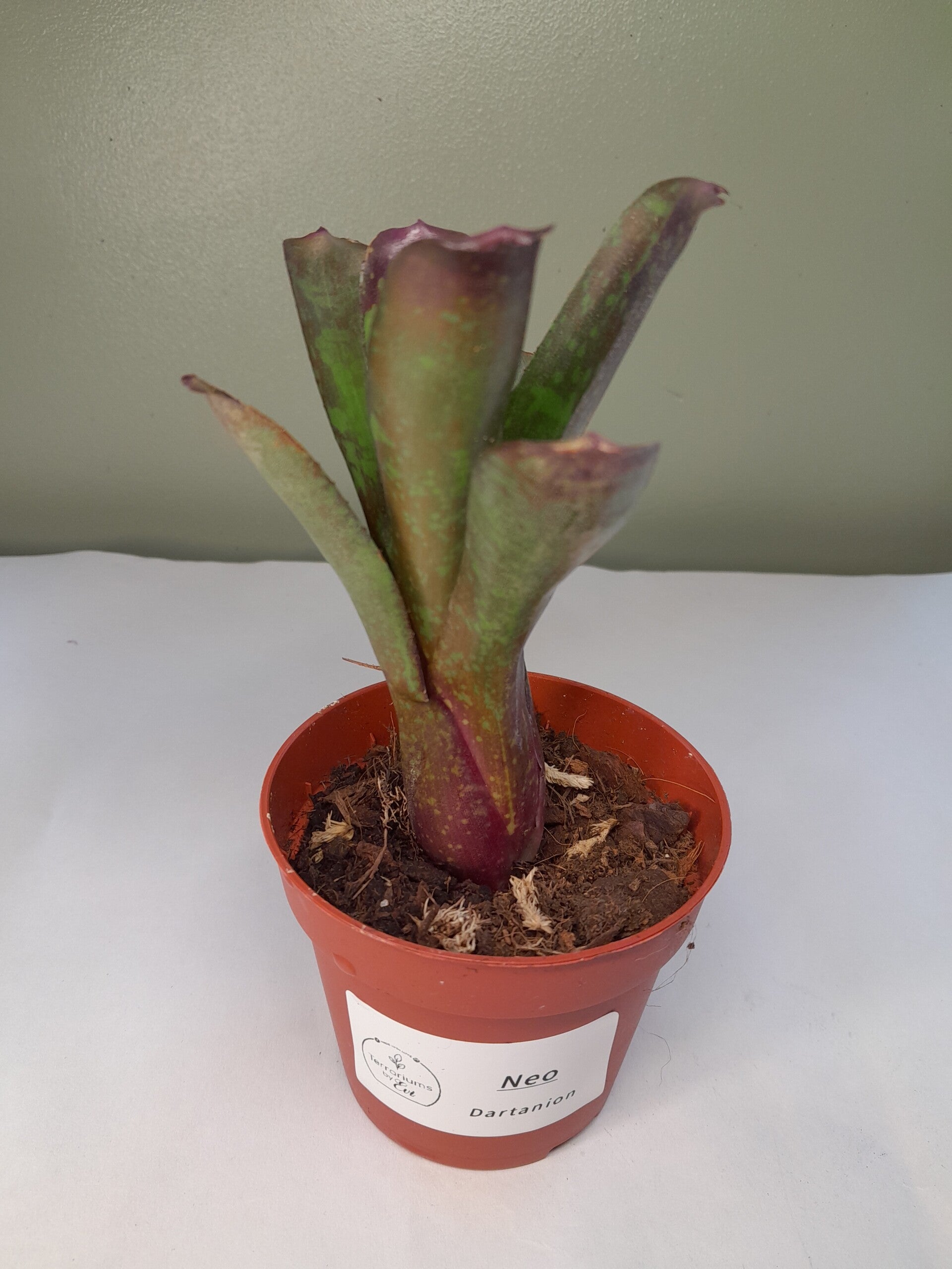 Deze bromelia is donker groen van kleur met mooie paarse accenten.