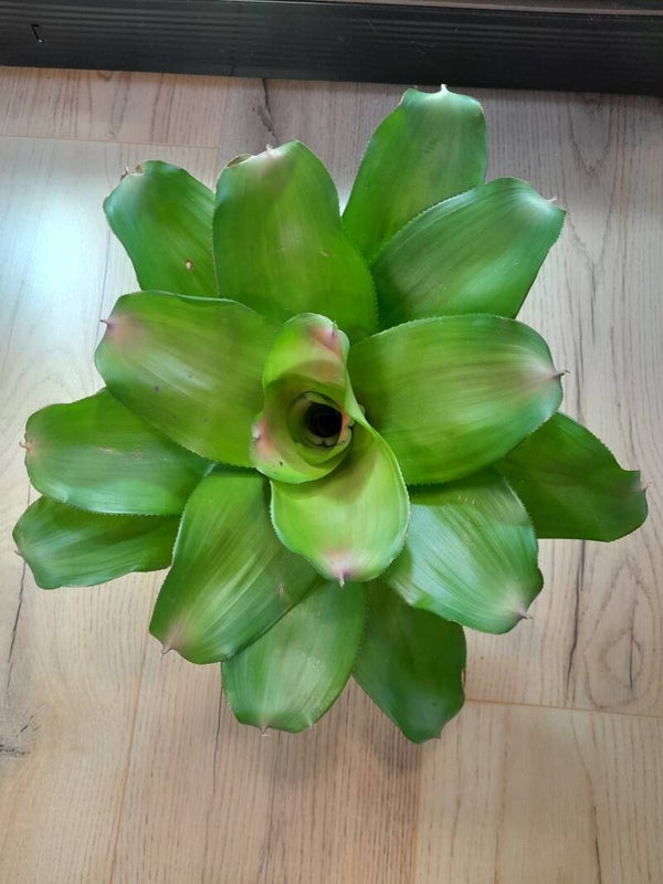 Deze bromelia heeft een groene kleur met licht roze schijn.