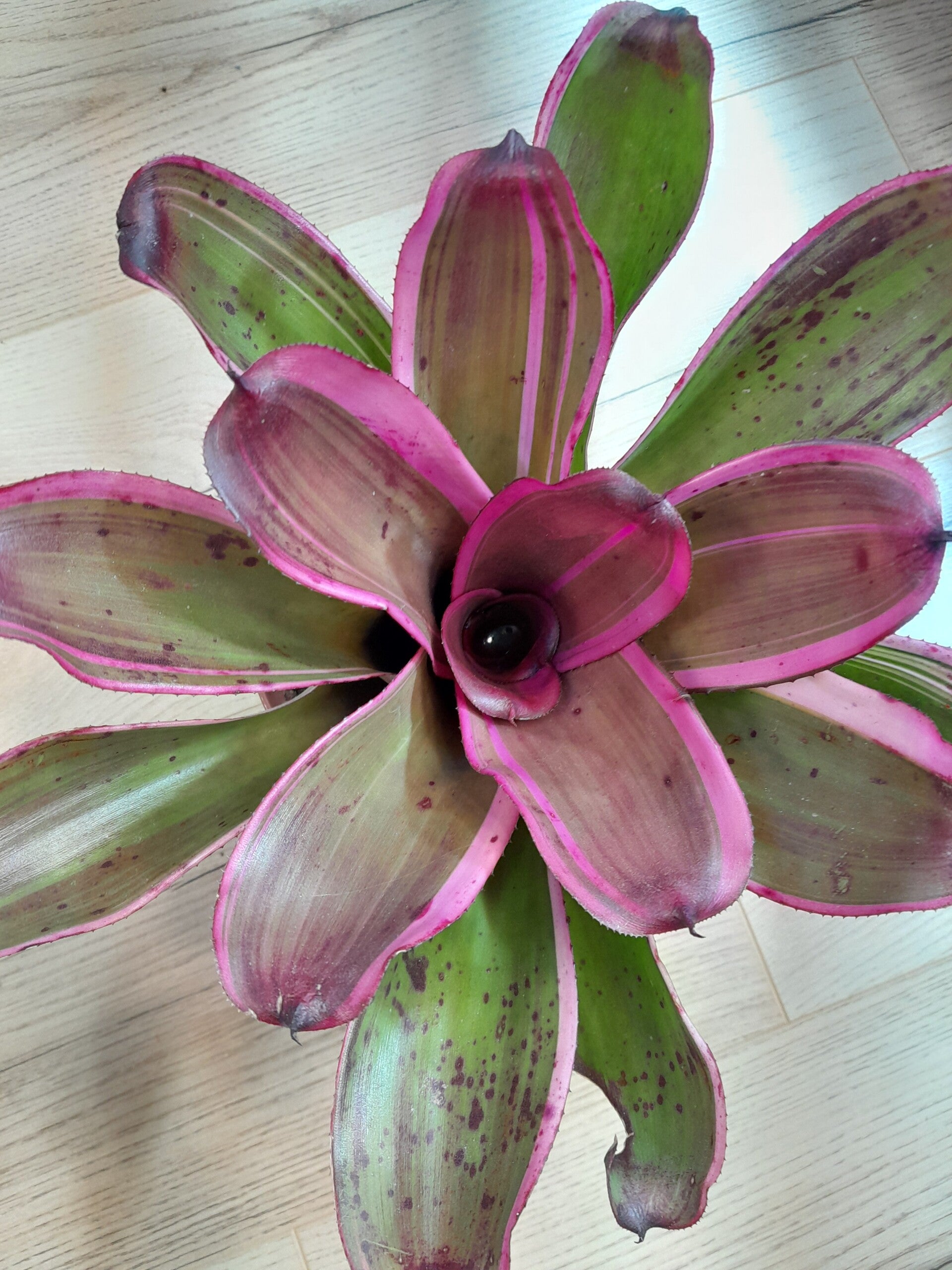 Deze bromelia heeft een groene kleur met witte omranding en de omranding kleurt paars onder het juiste licht.
